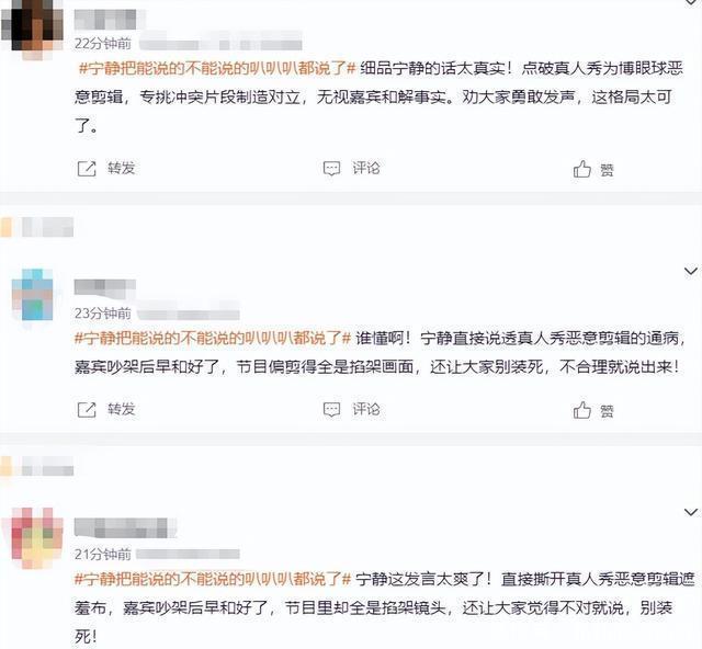 粉丝在看完这段视频后,也是纷纷对静姐的说法表示赞同,表示她直接撕开了“遮羞布”。 一个节目的好坏,并不是嘉宾是否有矛盾决定的,往往节目的质量和立意也是很重要的一点。